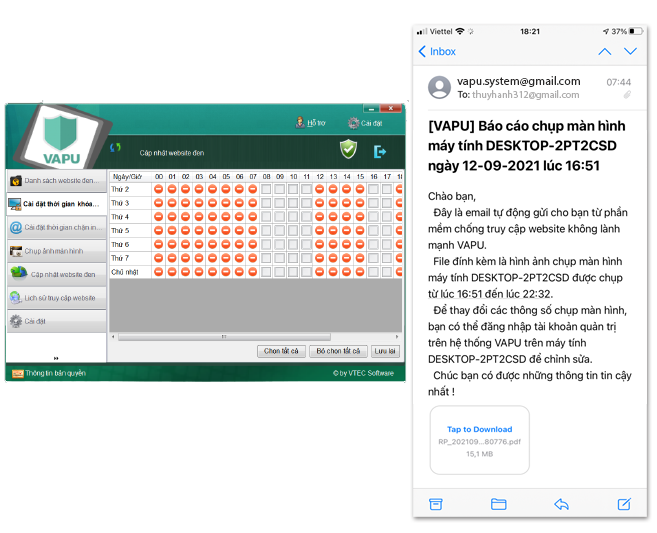 Với chức năng chặn website, hệ thống cho phép bố mẹ tùy chọn những gì cần chặn những trang web nào tùy mục đích của bố mẹ. Mặc định hệ thống sẽ chặn "Web đen" và "Game online", bố mẹ có thể chặn thêm "Mạng xã hội, Youtube" hoặc các kênh "Tin tức, giải trí" nếu muốn. Thậm chí bố mẹ có thể chặn tất cả các trang web chỉ để mở các trang mà bố mẹ cho phép con truy cập. Các chức năng chụp màn hình, gửi email báo cáo rất dễ dàng cài đặt theo từng tần xuất chụp màn hình như 15 giây, 30 giây, 1 phút ... /1 lần chụp. Thời gian gửi email báo cho bố mẹ cũng có thể cài đặt 1 tiếng, 6 tiếng, 1 ngày ... / 1 lần gửi. Hệ thống cho phép tùy biến theo nhu cầu kiểm soát con cái của bố mẹ. VAPU không chỉ là 1 phần mềm bảo vệ và giám sát máy tính, VAPU mong muốn là công cụ hữu hiệu cùng các bậc phụ huynh trong việc xây dựng môi trường học trực tuyến lành mạnh, đúng mục đích cho con cái. VAPU cũng là người bạn đồng hành của các đơn vị trường học, giúp môi trường học trực tuyến học đường an toàn và hiệu quả hơn. |